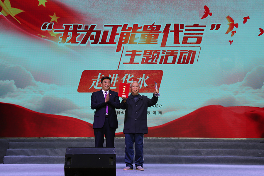 华北水利水电大学党委书记王清义为“我为正能量代言”贡献奖获得者刘慈欣颁奖,刘慈欣的老师代替他领奖