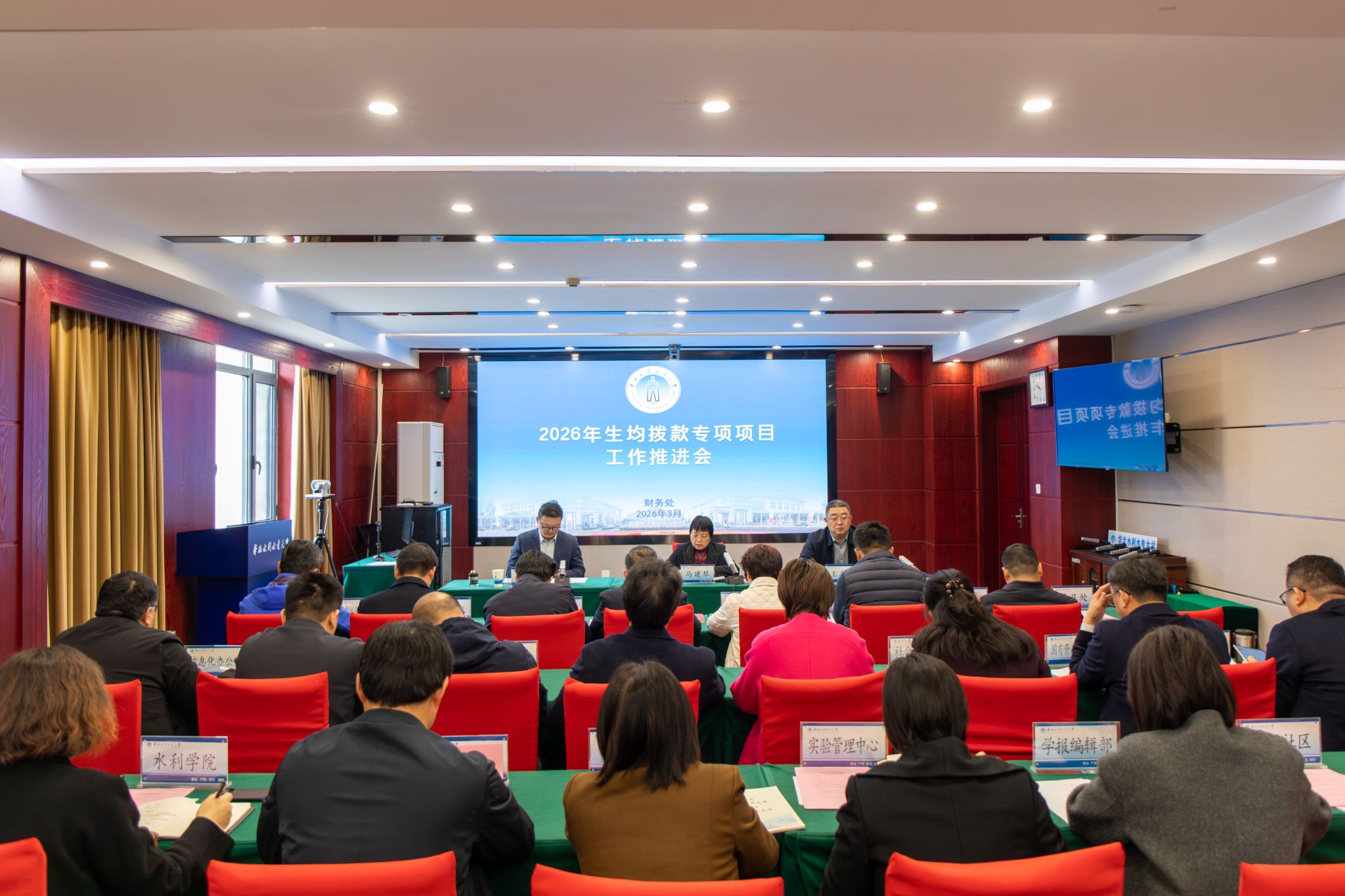 为加快推进2026年生均拨款专项项目实施,规范项目管理、提升资金使用效益,3月13日上午,我校在龙子湖校区综合南楼第四会议室召开2026年生均拨款专项项目工作推进会。副校长马建琴出席会议并讲话,党委办公室、校长办公室、纪委、国有资产管理处及2026年生均拨款项目申报实施单位负责人参加会议。会议由财务处处长王志国主持。