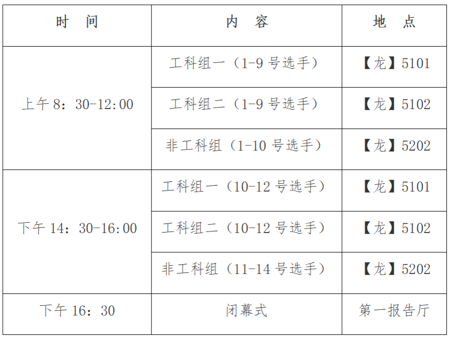 1.决赛时间、地点、分组。选手分组详情见附件1。现场比赛顺序以微信抽签后号码为准。