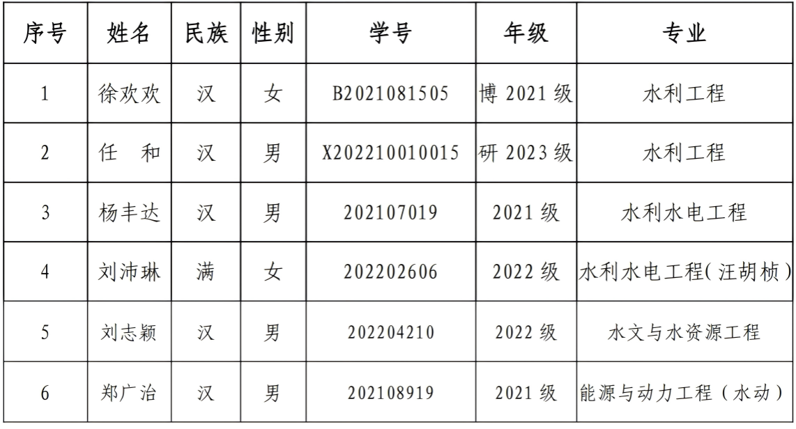 为弘扬潘家铮先生“忠诚敬业、求实创新”的精神,奖励热爱祖国水电水利事业、品学兼优、勇于创新的本科生和研究生,根据《潘家铮水电奖学金实施细则》的规定和相关要求,经过学生自荐,各学院资格审查,评选出第十五届潘家铮水电奖学金候选人6名,现公示如下: