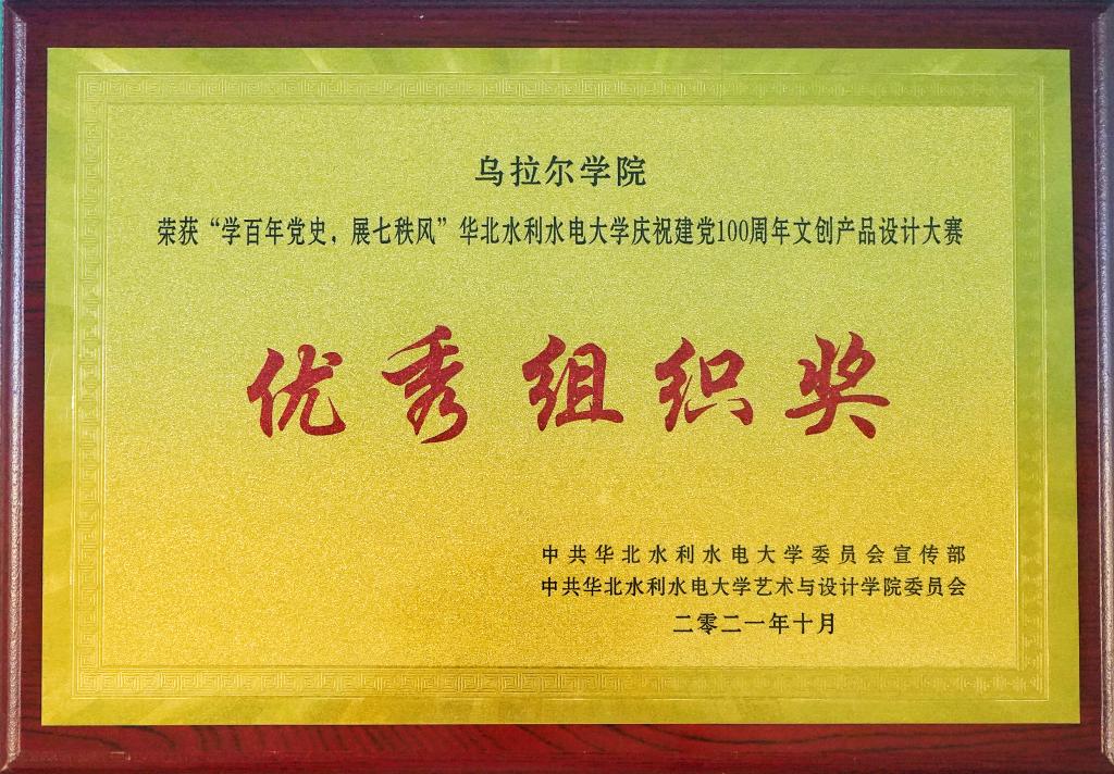 “学百年党史,展七秩风”华北水利水电大学庆祝建党100周年文创设计大赛优秀组织奖(2021.10)
