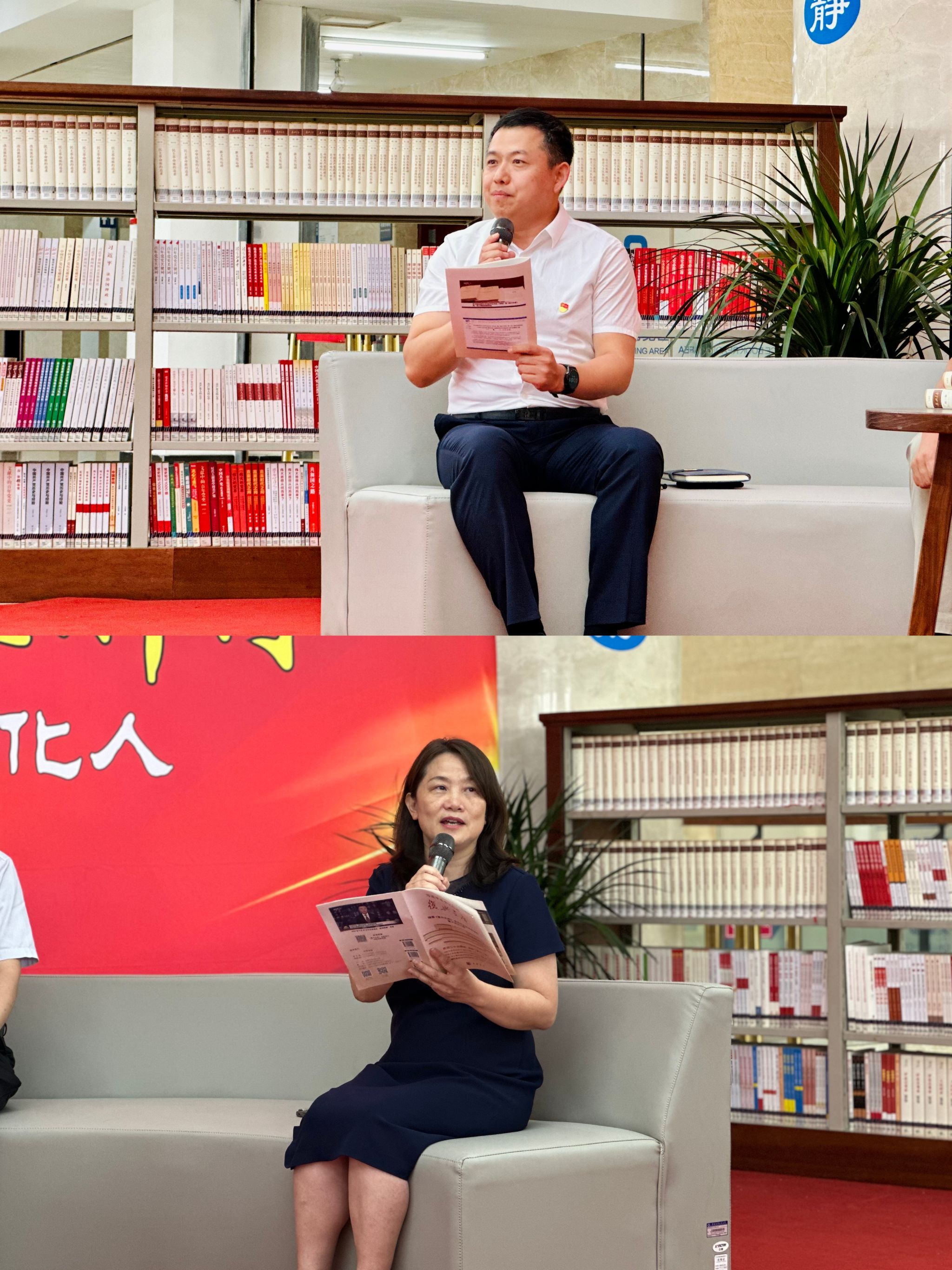 图书馆第一党支部书记石皓、采编部主任王广三,分别结合图书馆采编和管理工作经历,分享阅读《复兴文库》的不同感受,表示《复兴文库》这部巨著让自己深入理解中华民族的历史和文化,更加坚定对图书馆工作的热爱和信心,将以更加饱满的热情和更加扎实的工作作风,为读者提供更加优质的文献服务;表示一定要坚定理想信念、凝聚精神力量,为实现中华民族的伟大复兴梦贡献自己的智慧和力量。马克思主义学院新思想概论教工党支部书记教师霍贺,在分享时谈到要认真学习《复兴文库》,感悟历史,坚定自信,扛起使命担当,在复兴之路上坚定前行。学生代表黄梦琪、张晴则以充满朝气的声音,表达了新时代青年对历史的敬畏和对民族未来的担当。
