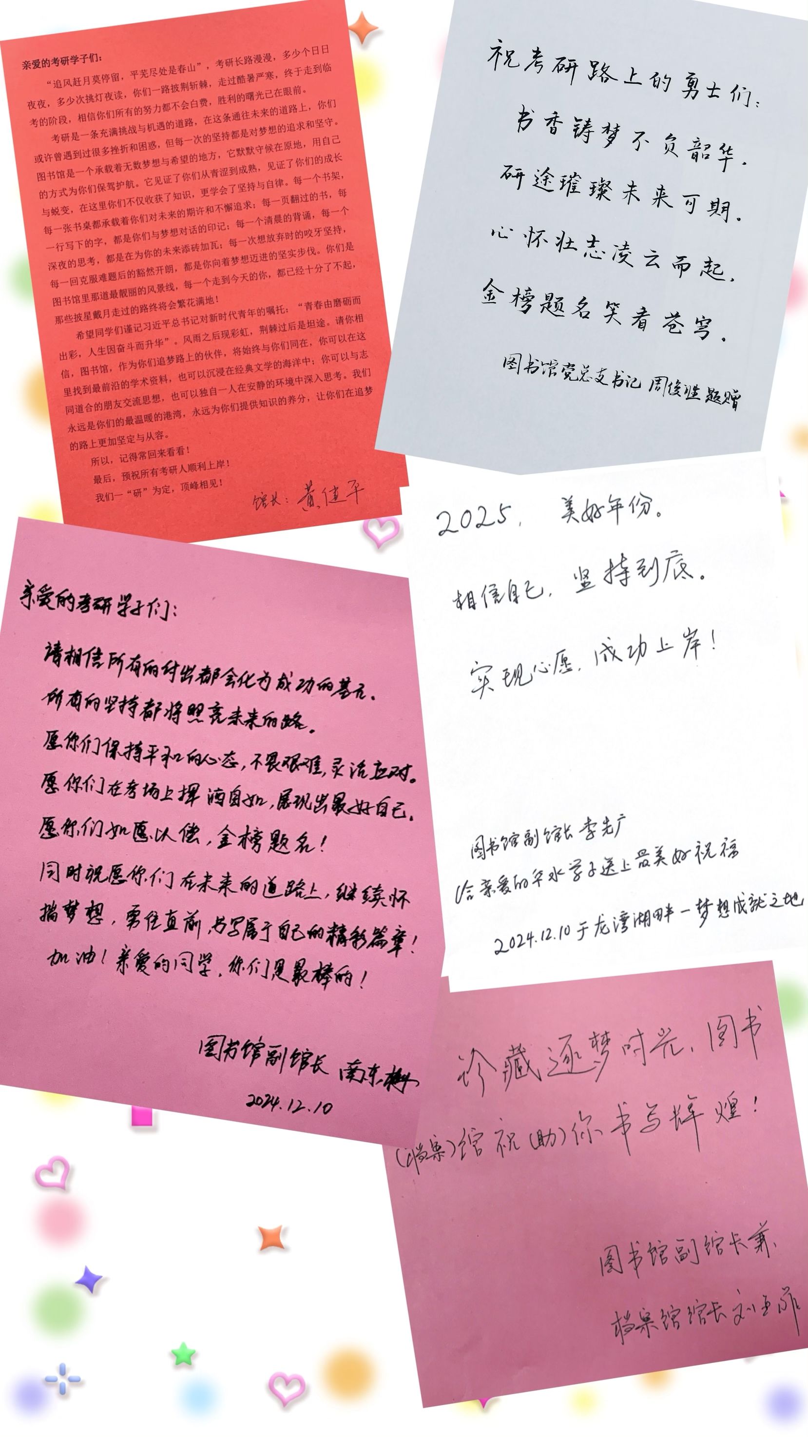 进入考研季以来,图书馆党总支、图书馆(档案馆)领导班子高度关注考研学子在馆学习情况及需求,持续关注活动的开展,并亲笔写下寄语,图书馆不仅是知识的殿堂,更是学子们追梦路上的坚强后盾,希望通过开展“爱心助力,研图同行”活动,让考研学子们感受到来自图书馆(档案馆)教职工的深切关爱,我们将尽之所能,提供最优质的服务和资源,助力学子们圆梦成功!
