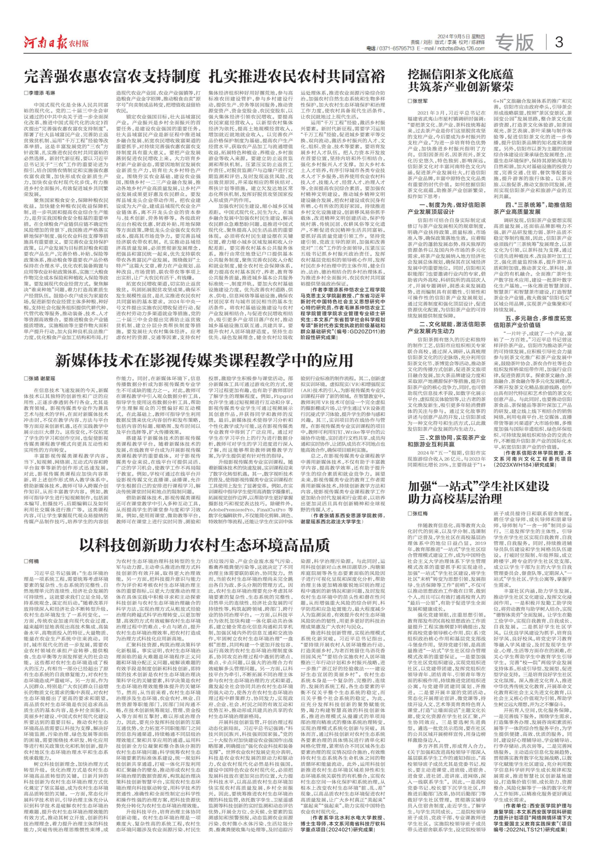 《河南日报》(农村版)2024年9月5日 第3版以科技创新助力农村生态环境高品质何楠习近平总书记强调:“生态环境治理是一项系统工程,需要统筹考虑环境要素的复杂性、生态系统的完整性、自然地理单元的连续性、经济社会发展的可持续性。这就要求我们立足全局,坚持系统观念,谋定而后动。”随着改革开放持续深...