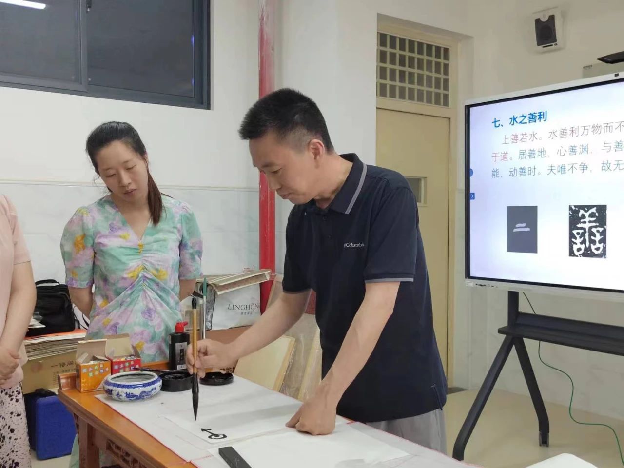 活动邀请书法研究所所长,艺术学院副院长金玉甫教授作了《甲骨文中的水文化》的主题报告并进行现场书法指导。水务培训中心主任何楠、党总支书记孟治刚,校工会副主席、郑东新区春华学校教育集团(华水校区)党支部书记王志国,郑东新区春华学校教育集团(华水校区)副校长拜然、水情教育基地办公室主任郝丽君参加活动。