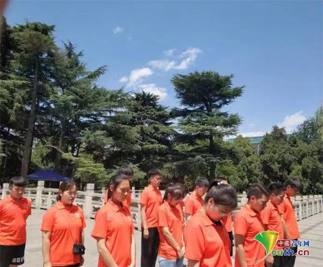 小红心探郑州实践队队员于纪念碑前默哀。白玉清 摄