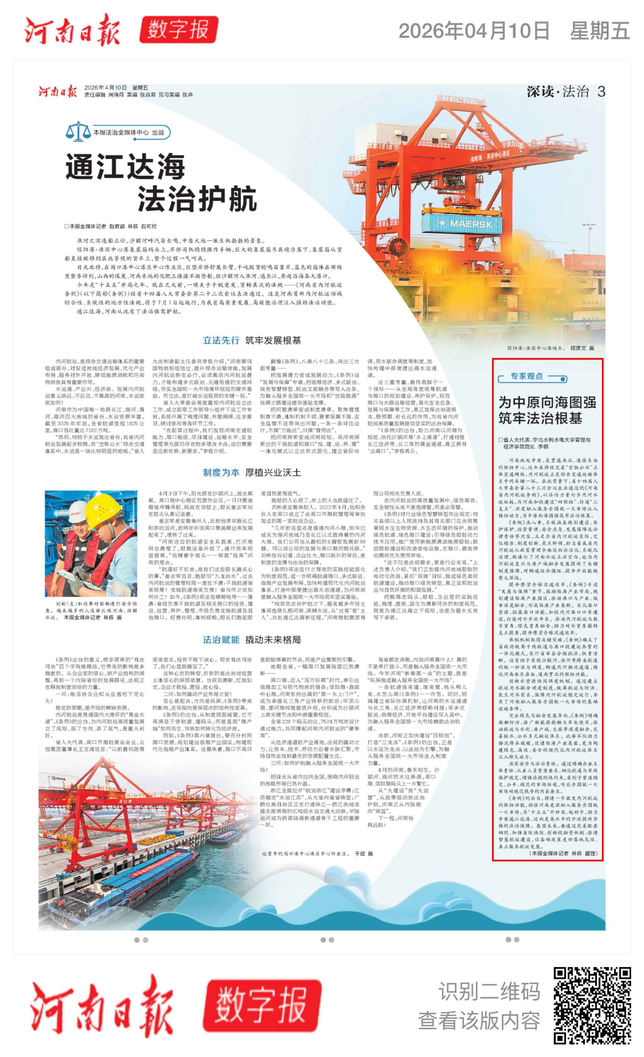 《条例》共八章,系统涵盖规划建设、养护保护、经营管理、安全应急、发展保障及法律责任等内容,立足全省内河航运实际,定位精准、制度创新、亮点鲜明,标志着我省内河航运从政策管理全面迈向法治化、系统化治理,既填补了河南水运立法空白,也为内河航运复兴与港产城融合发展提供了关键制度保障,对畅通经济循环、提升开放能级意义深远。