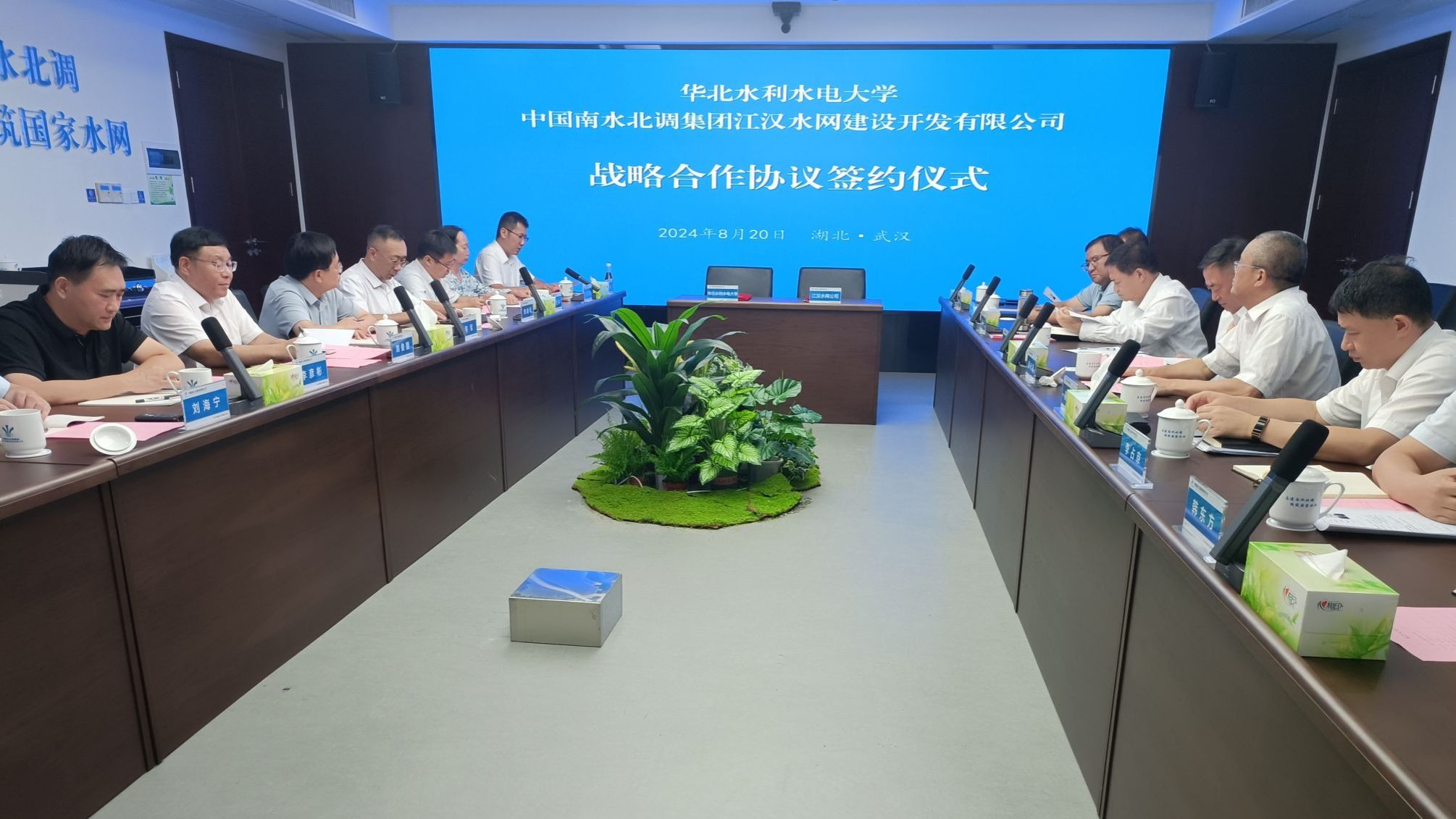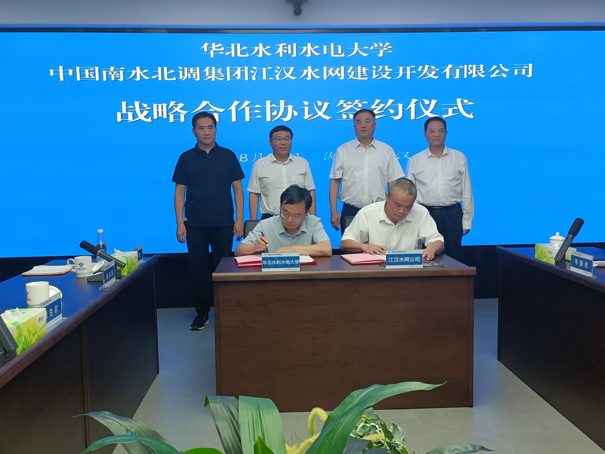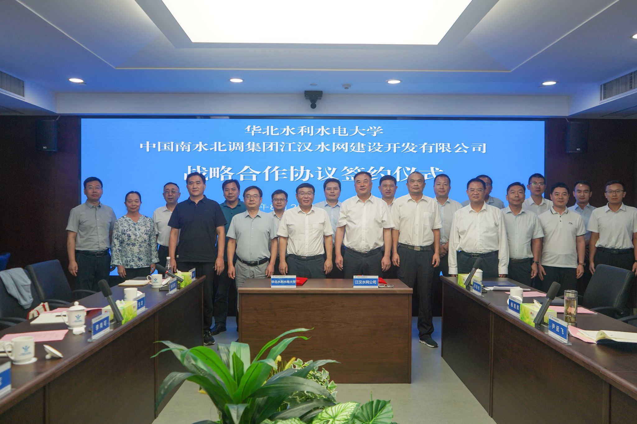 为进一步深入贯彻习近平总书记“节水优先、空间均衡、系统治理、两手发力”治水思路和推进南水北调后续工程高质量发展的要求,围绕国家水网建设的需求,积极服务南水北调工程建设等国家重大战略和重点任务,8月20日,校党委副书记、校长刘俊国、副校长赵军、李彦彬一行赴中国南水北调集团江汉水网建设开发有限公司(以下简称“江汉水网”)探讨战略合作机制并签订战略合作协议。江汉水网党委副书记、总经理于涛、党委副书记贾志营、党委委员、副总经理尹延飞及有关部门负责人出席签约仪式。仪式由贾志营主持。