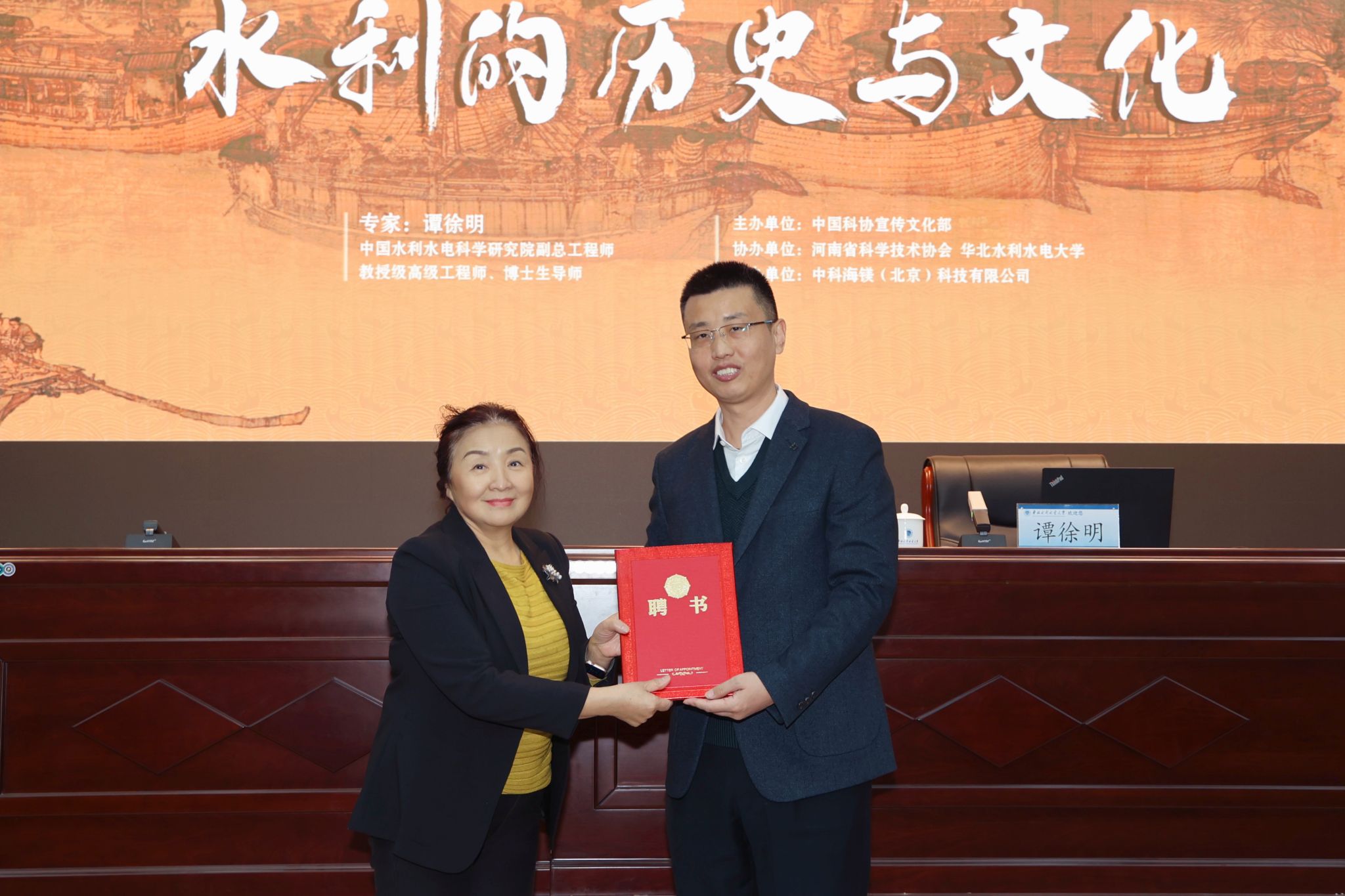 2024年12月5日上午,由中国科学技术协会主办、河南省科学技术协会协办、我校承办的“文明的烛火——中国科学文化探源河南行”科学文化专场讲座在我校龙子湖校区综合实验楼多功能报告厅成功举行。中国科协宣传文化部二级巡视员姚振清、副校长张志增,河南省科协调研宣传部副部长、三级调研员王静,中科海镁(北京)科技有限公司总经理杨文学参加活动。国内知名水文化专家、中国水利学会水利史研究会会长、中国水利水电科学研究院副总工程师、教授级高级工程师、博士生导师谭徐明作了“水利的历史与文化”的精彩讲座,并受聘成为我校水文化研究中心特聘研究员。中国科协宣传文化部二级巡视员姚振清主持讲座。