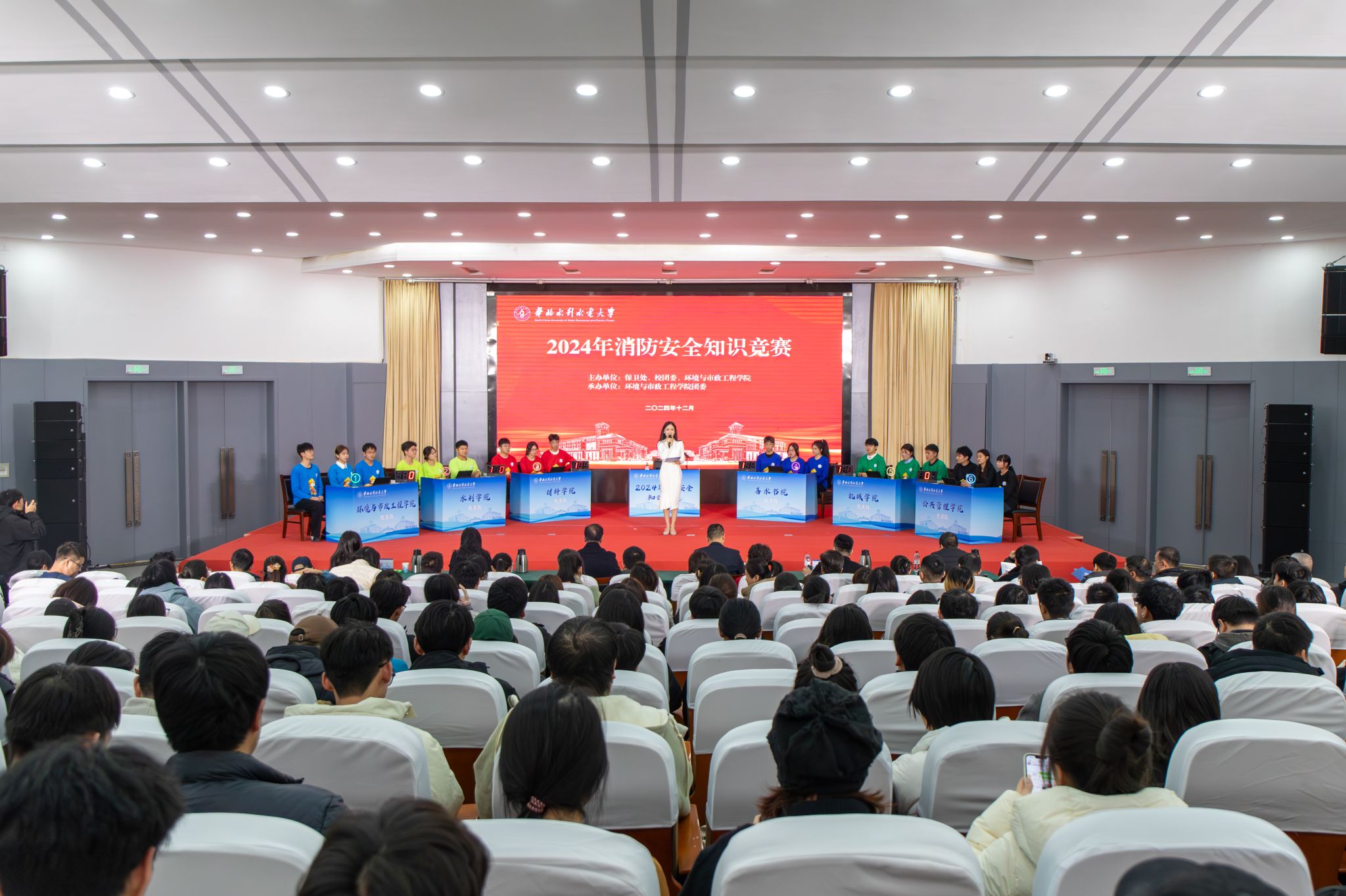 本次竞赛由保卫处、校团委主办,环境与市政工程学院承办,校消防安全委员会委员单位及教学单位负责同志和师生代表400余人参加。材料学院代表队荣获决赛一等奖,环境与市政工程学院和善水书院代表队荣获二等奖,公共管理学院、机械学院和水利学院代表队荣获三等奖,现场领导依次为线上获奖学生代表、各学院获奖代表队和10个优秀组织单位颁发荣誉证书并合影留念。