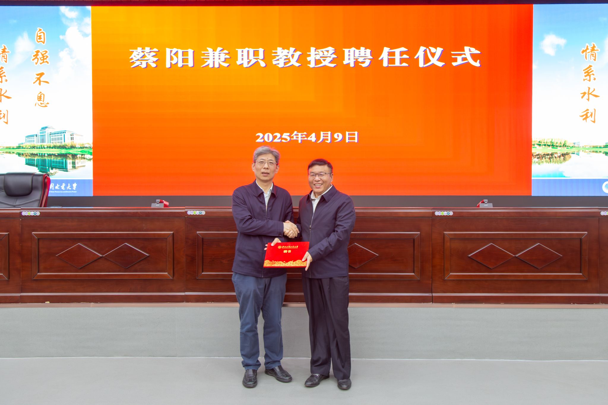王笃波代表学校党委对蔡阳教授的加盟表示热烈欢迎和衷心感谢。他指出,学校党委高度重视人才工作,深入学习贯彻习近平总书记关于人才工作的重要论述,持续加强党对人才工作的领导,强化顶层设计,不断加快“战略人才——领军人才——潜力人才”网络体系建设,高层次人才引进取得实质性进展。推进数字孪生水利建设是推动我国新阶段水利高质量发展、保障国家水安全的六条实施路径之一,学校围绕数字孪生水利前沿科技难题和人才培养提前布局,为加快推进学校“双一流”创建和发展水利新质生产力提供科技和人才支撑等方面发挥积极作用。蔡阳教授的加盟,必将为学校“双一流”创建和水利工程学科冲A注入新的活力和强大动力。仪式上,刘俊国代表学校为蔡阳教授颁发了兼职教授聘任证书。