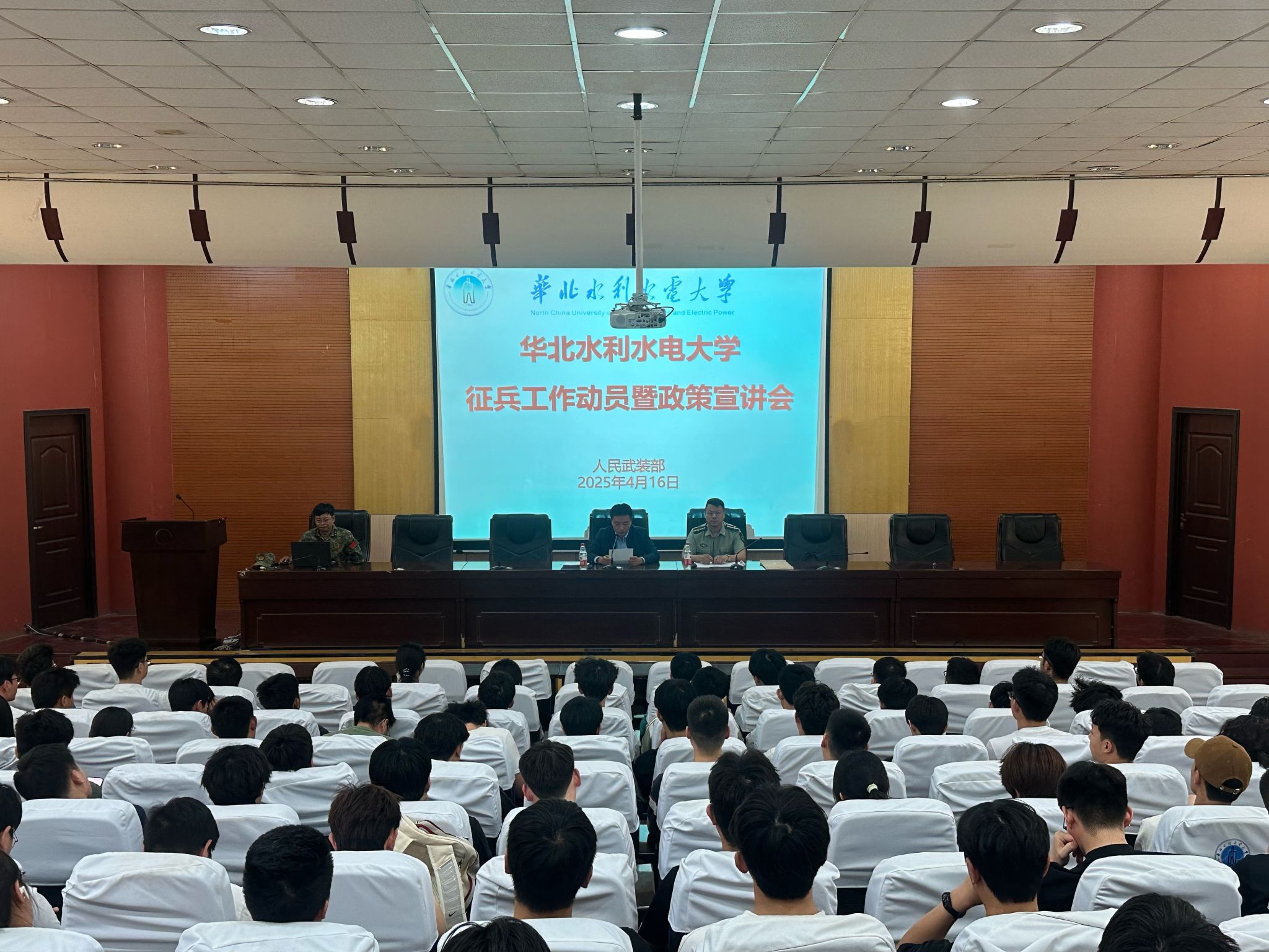 为持续贯彻落实国家征兵政策和上级工作要求, 4 月 16 日下午,校人民武装部在花园校区讲堂三教室组织召开了征兵工作动员暨政策宣讲会。人民武装部副部长董行、人民武装部军事科科长王明磊出席,会议由董行主持,花园校区各学院辅导员、有意向参军入伍的应届毕业生及在校生200余人参加了会议。
