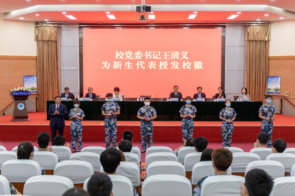 王清义为新生代表授发华北水利水电大学校徽。全体2022级新生共同佩戴起承载着使命与荣光的华北水利水电大学校徽,亮明“华水人”身份,正式成为华水一份子,祝愿学子们在华水校园激扬青春、收获理想。
