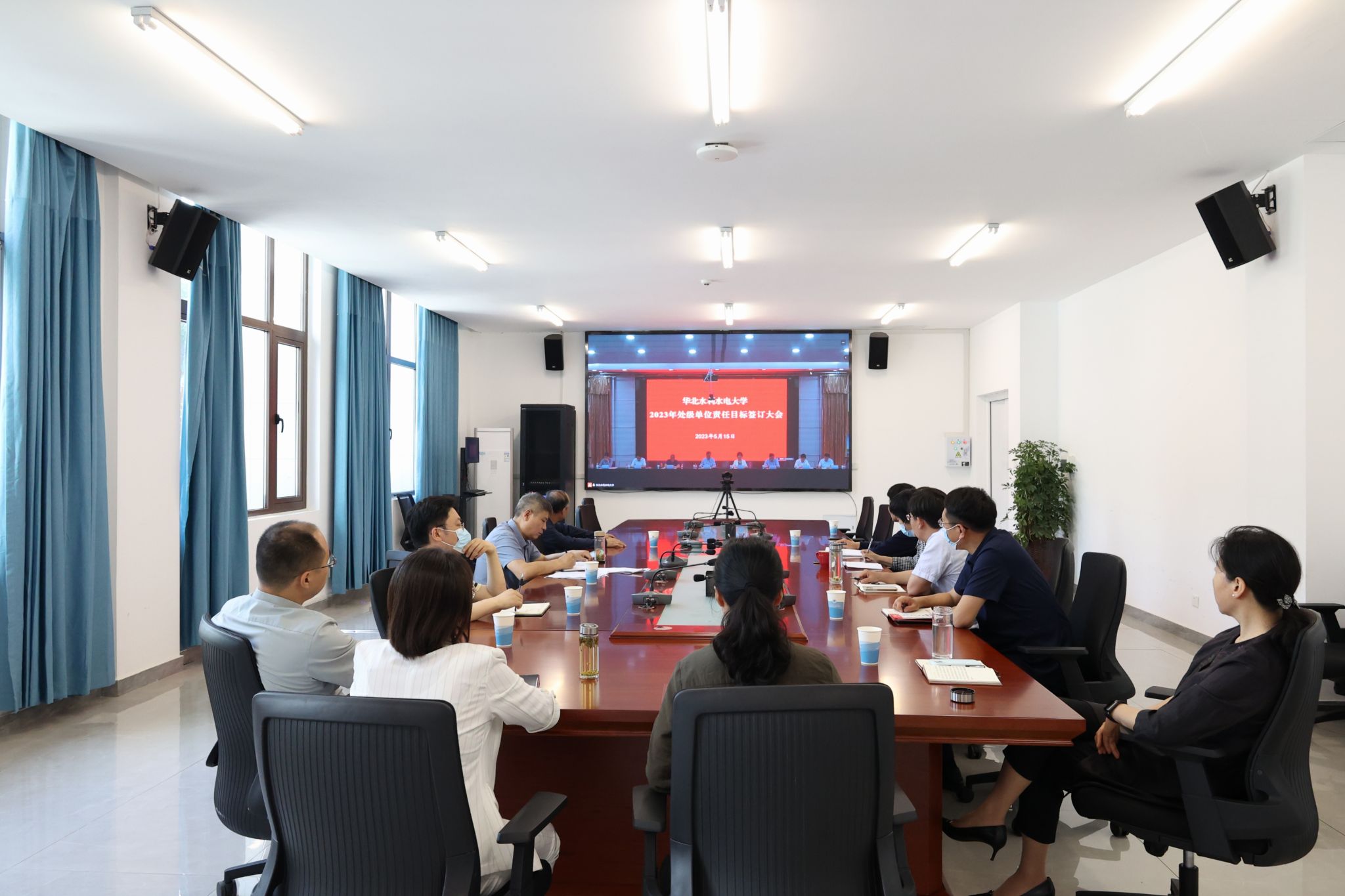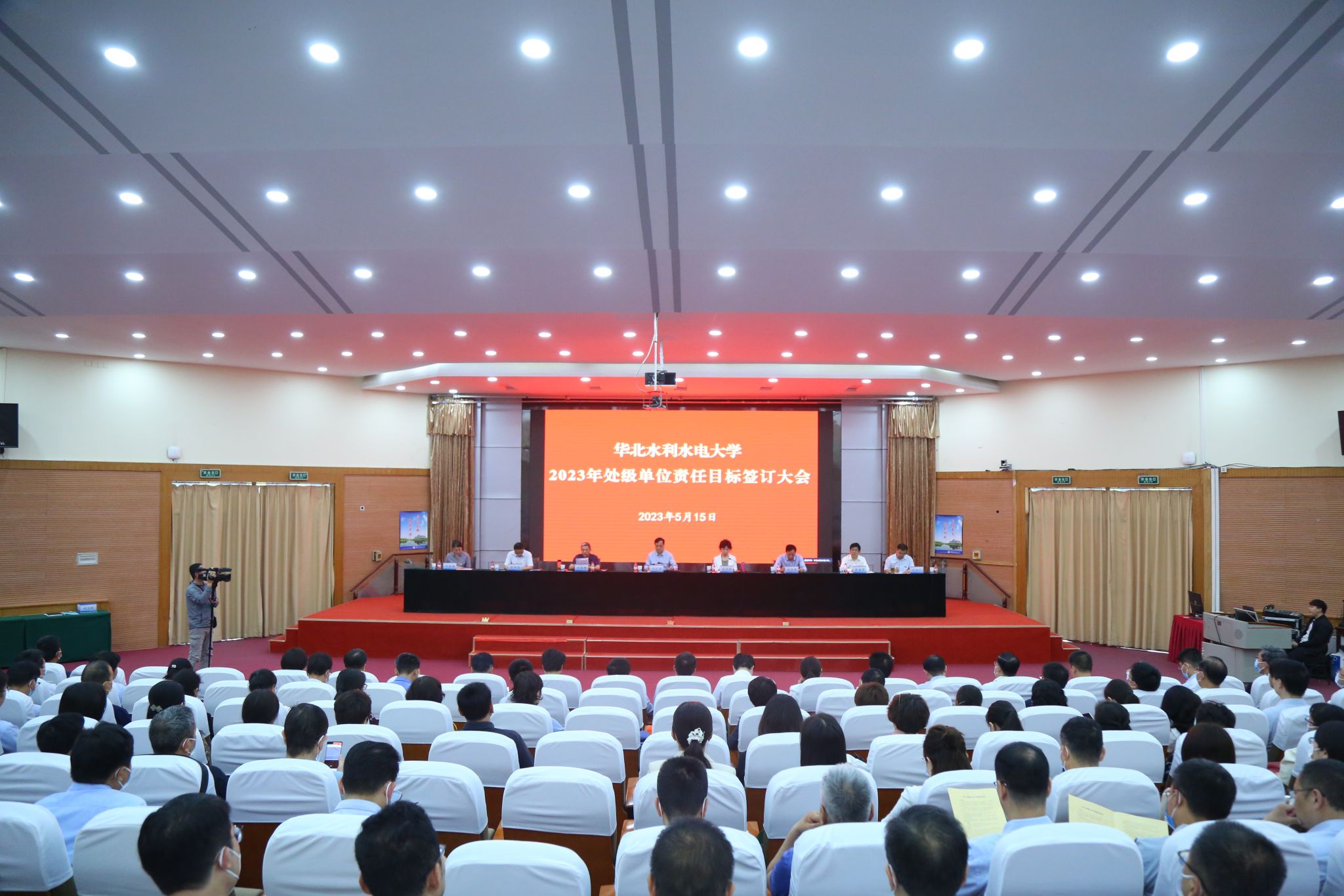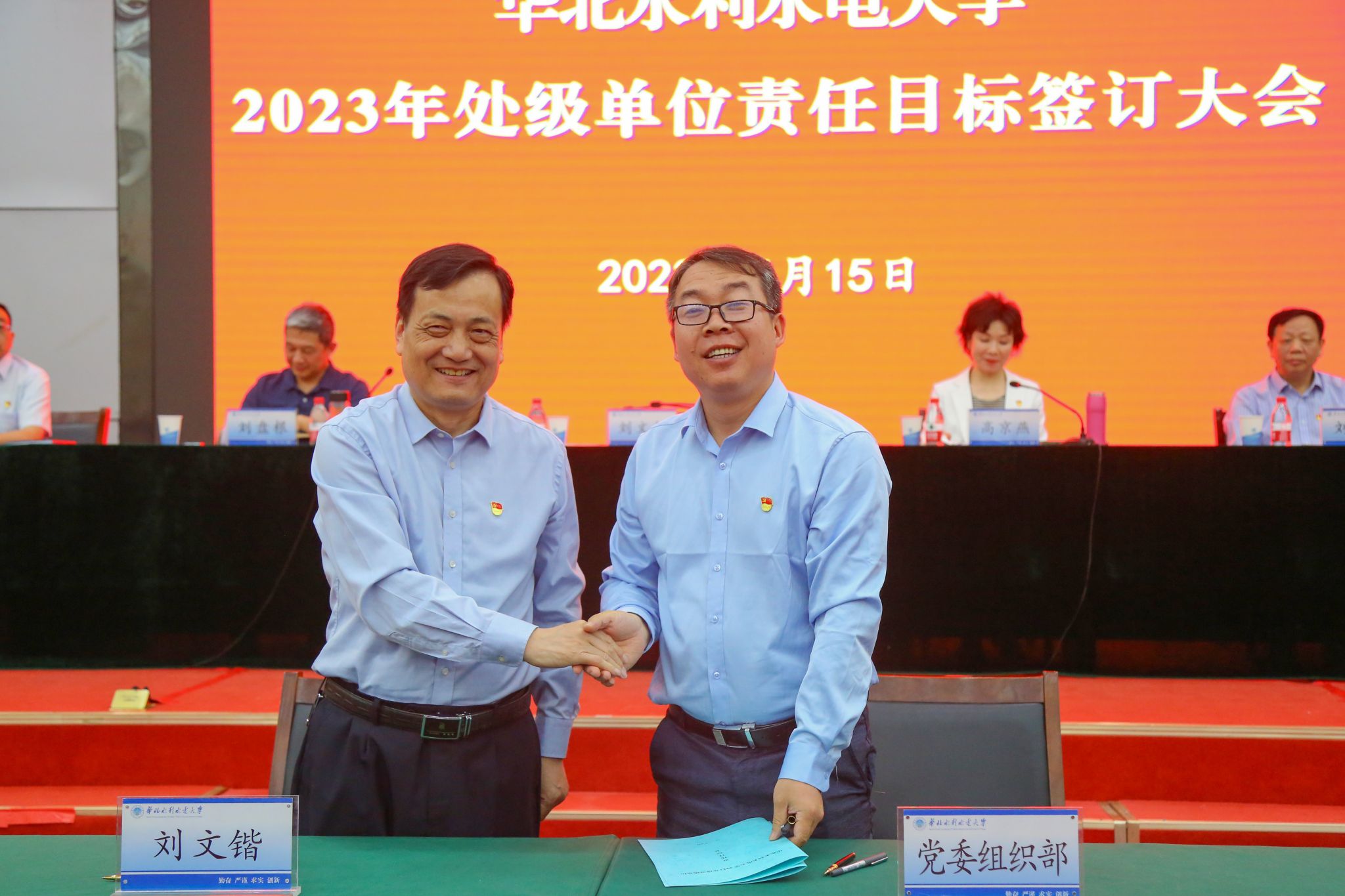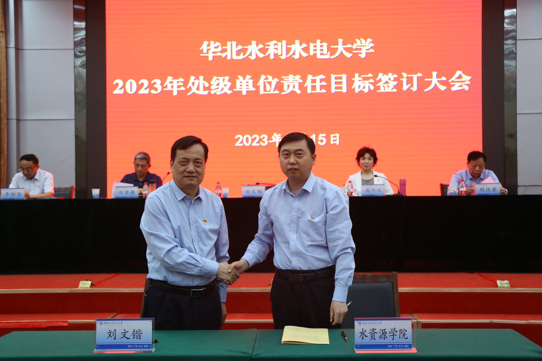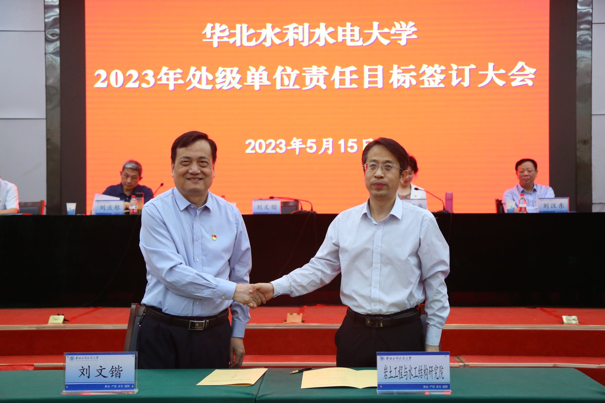 刘文锴代表学校分别与党委组织部(党校、党委人才工作领导小组办公室)、一流学科创建办公室、水资源学院、岩土工程与水工结构研究院四个单位代表签订了2023年度责任目标书。