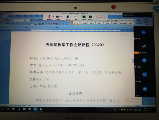 3月20日上午,法学院以腾讯会议视频形式召开教学工作会,通报法学院防“疫”期间的教学工作,总结开学以来线上教学的经验和不足,安排下一阶段的工作。王华杰院长、张胜前书记、教学指导委员会成员、学工办、办公室、模拟法庭代表等参加了本次会议。会议由教学副院长万钧主持召开。