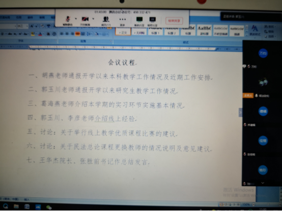 第三个环节是教学指导委员会讨论通过了“关于举行线上教学优质课程比赛”和“关于民法总论课程更换教师”等两项议题。