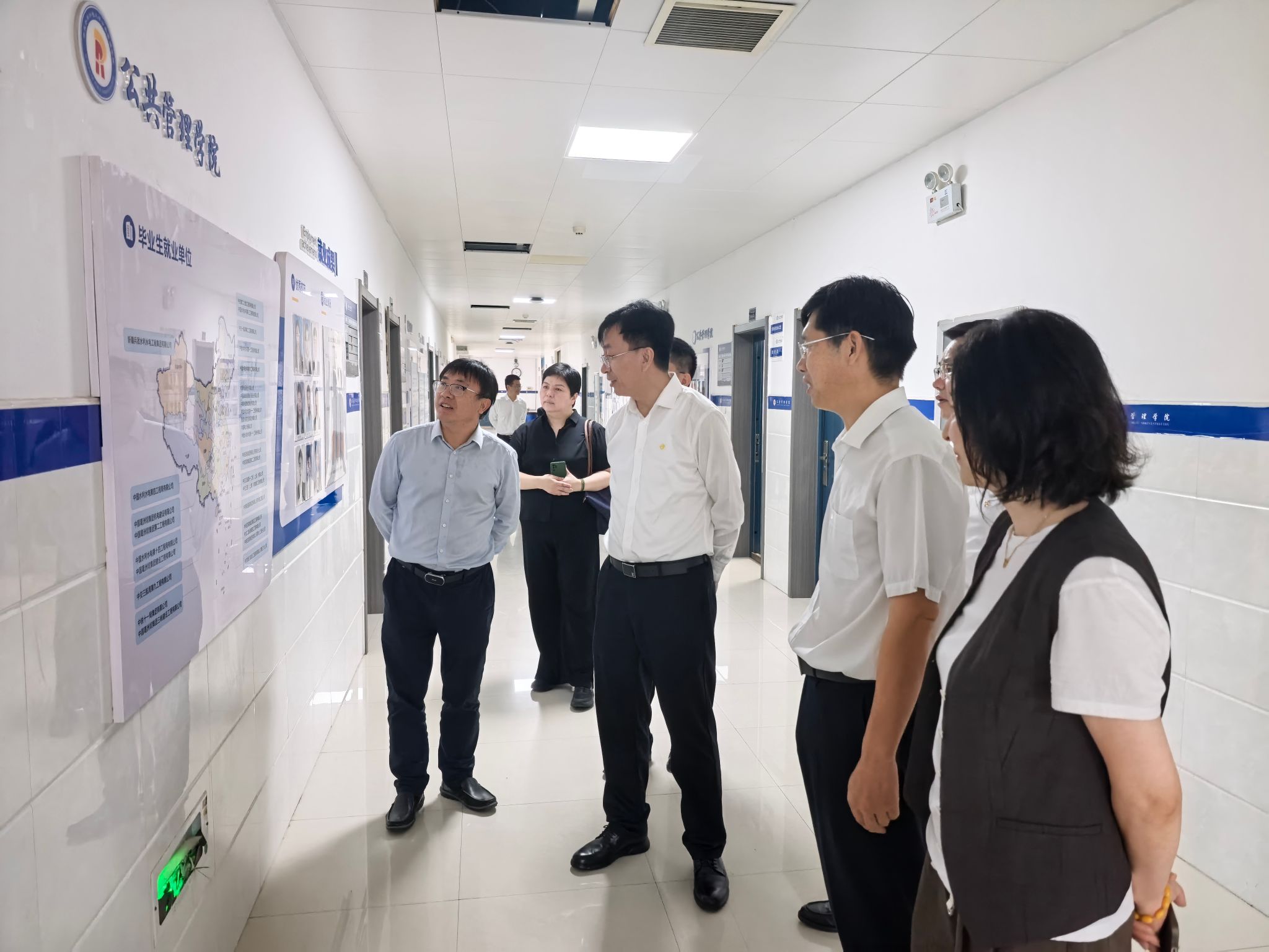 座谈会前,程绪红一行参观了学院廊道文化墙。墙上展示着学院的发展历程、学科特色、师资力量及往届毕业生就业数据——从“公共管理类专业国家级一流本科专业建设点”的建设成果,到近三年毕业生在水利工程管理、城市公共服务等领域的就业分布,生动呈现了学院“立足公共管理、服务水利行业”的鲜明办学定位。当看到往届学生进入大型企业从事项目管理、行政协调等工作的案例时,程绪红深有感触地说:“在工程项目推进中,公共管理专业人才在工程协调、政策对接、团队管理等环节发挥着不可替代的作用这种‘软实力’正是企业发展中迫切需要的重要支撑。”