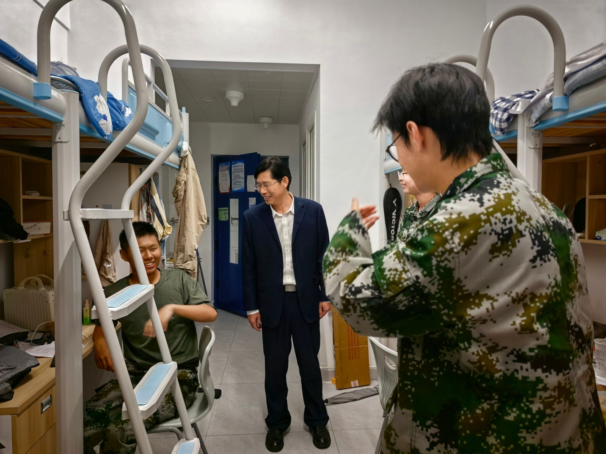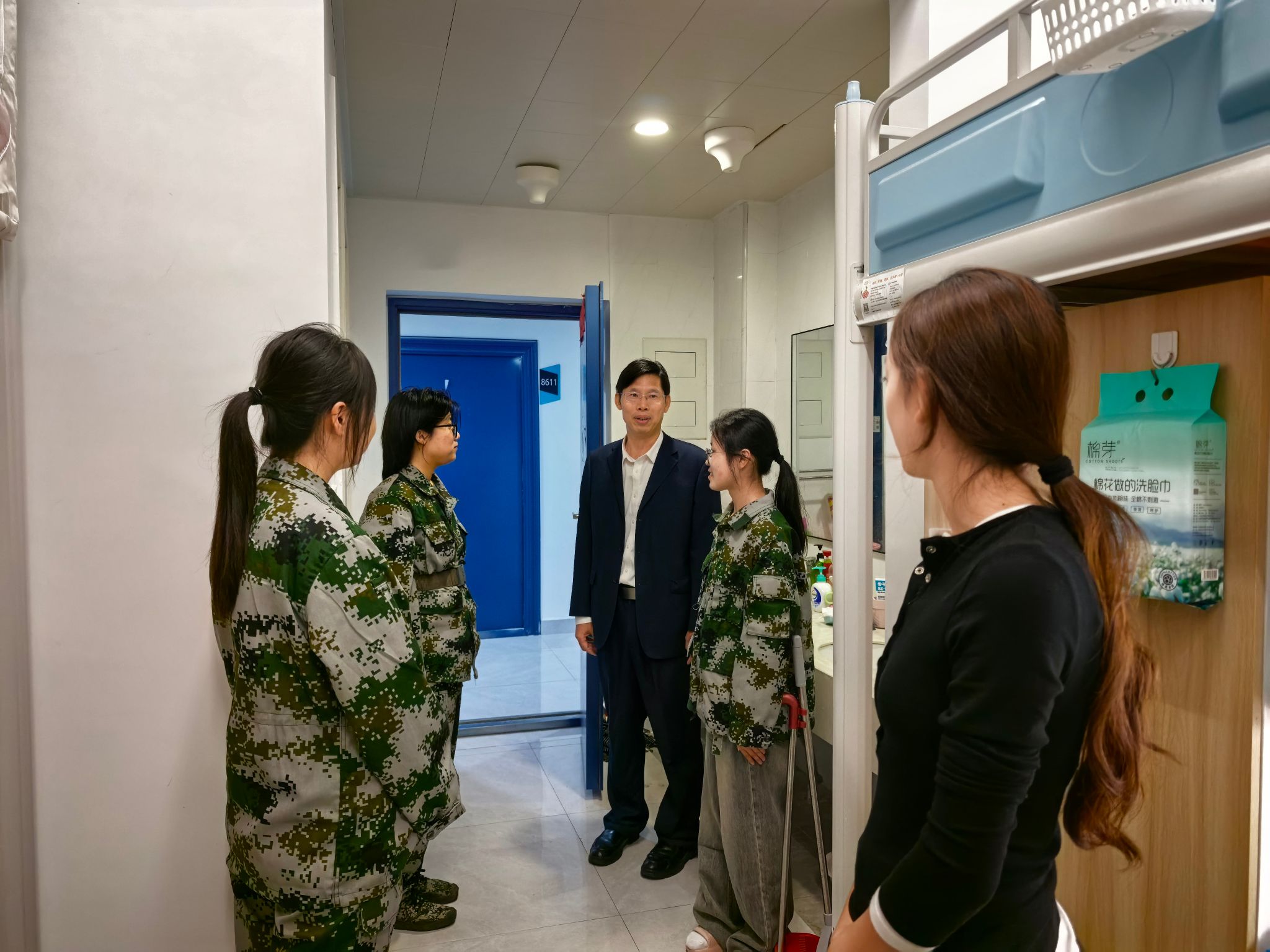 走进宿舍,何芹书记首先关切地查看了新生的住宿环境,从床铺整理、物品摆放,到水电使用、生活物资准备情况,逐一细致询问,“被子够不够厚?”“有没有遇到生活上的难题?”一句句亲切的问候,瞬间拉近了与新生的距离,让初入校园的同学们感受到了学院如同家人般的关怀。在与新生的交流中,何芹书记围绕同学们最关心的话题展开深入沟通。针对专业学习,他结合学院的办学定位,详细介绍了行政管理、劳动与社会保障专业的发展历程、课程体系特色——从核心课程的学习重点,到实践教学环节的校企合作项目、社会调研机会,让新生对未来的专业学习有了清晰认知;谈及就业前景,他列举了往届毕业生在政府部门、事业单位、社会组织等领域的就业案例,鼓励同学们提前做好职业规划,在大学期间积极提升专业能力与综合素养。