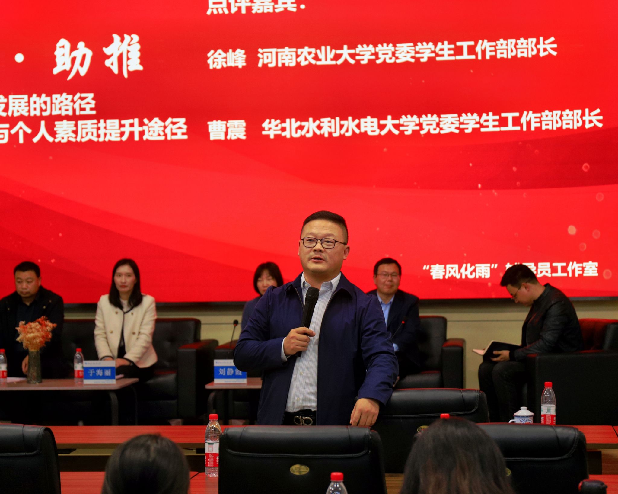 徐峰部长对本次论坛进行了点评,他表示主讲嘉宾们的发言都有着很大的借鉴意义,思路清晰、要点颇多,提出助推辅导员发展要从学校领导、平台帮助、个人努力三个方面开展。同时分享了河南农业大学辅导员队伍的建设成绩与经验,告诫大家外界只是一个促进作用,个人能力提升需要自身拼搏与努力。