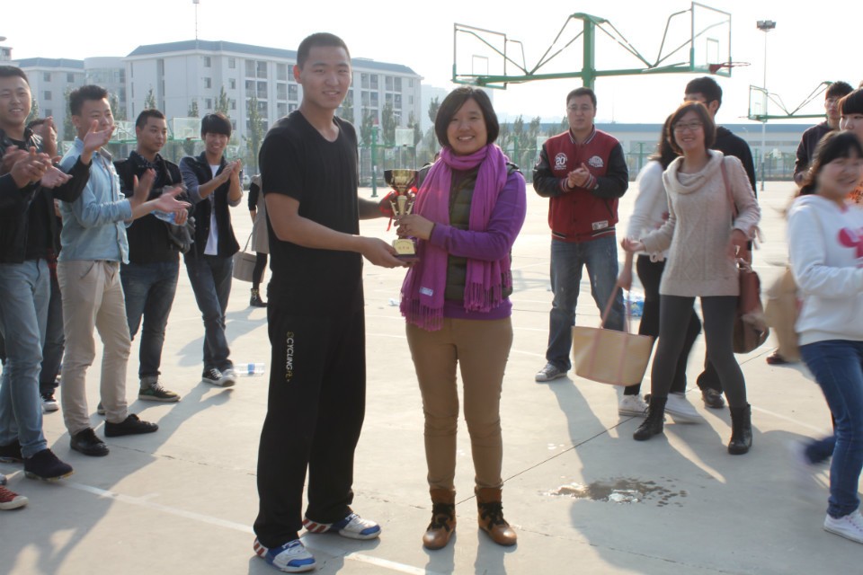 最后,由史书记,13级辅导员王志勇老师和11级辅导员沙成老师给这次篮球比赛的冠、亚军获得者颁发奖状和奖杯,赛场上不断传来的欢呼声显示着同学们激动地心情。