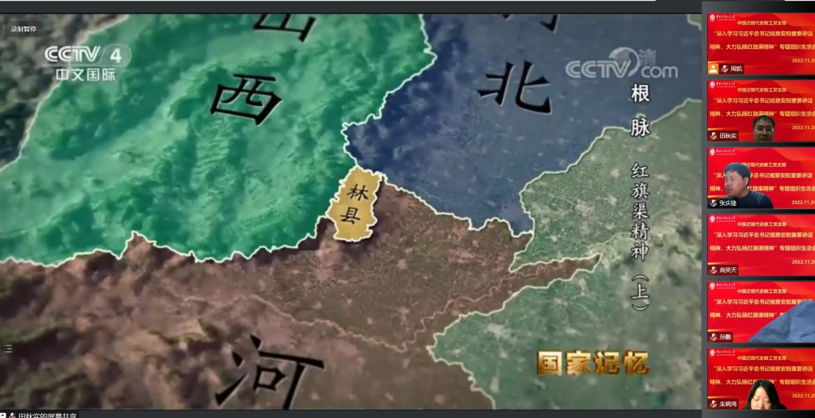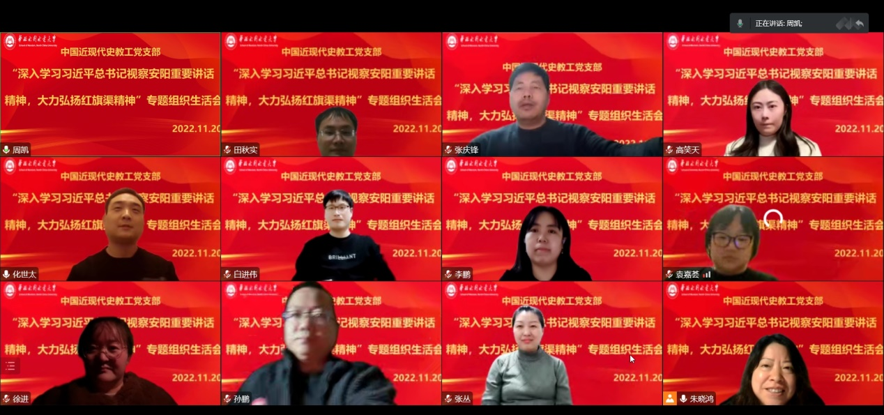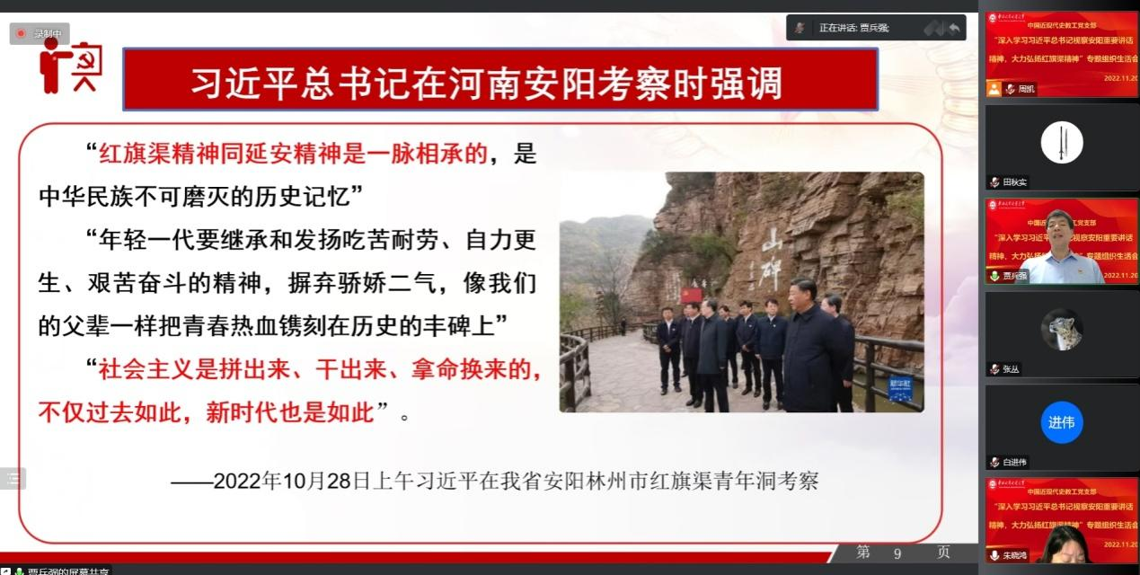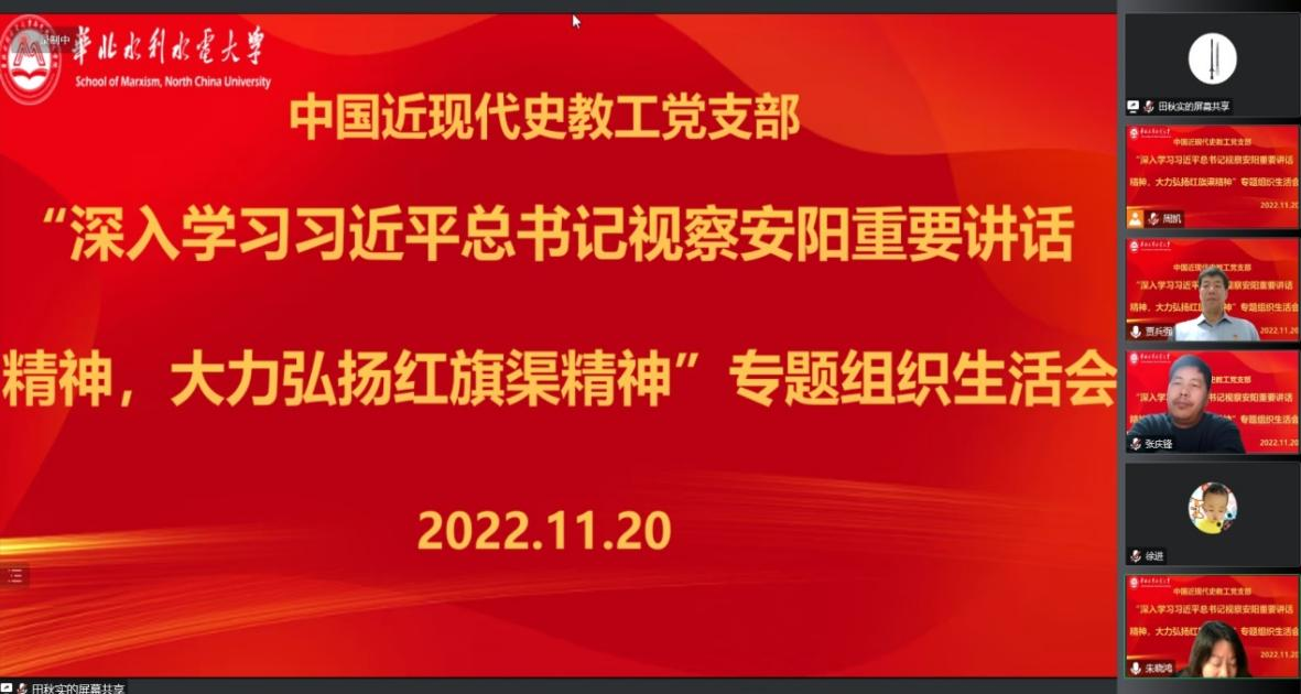 为深入学习贯彻党的二十大精神和习近平总书记视察安阳重要讲话精神,11月20日晚,中国近现代史教工党支部召开“深入学习习近平总书记视察安阳重要讲话精神,大力弘扬红旗渠精神”专题组织生活会,学院副院长贾兵强及支部全体党员参加会议。会议由党支部书记朱晓鸿主持。