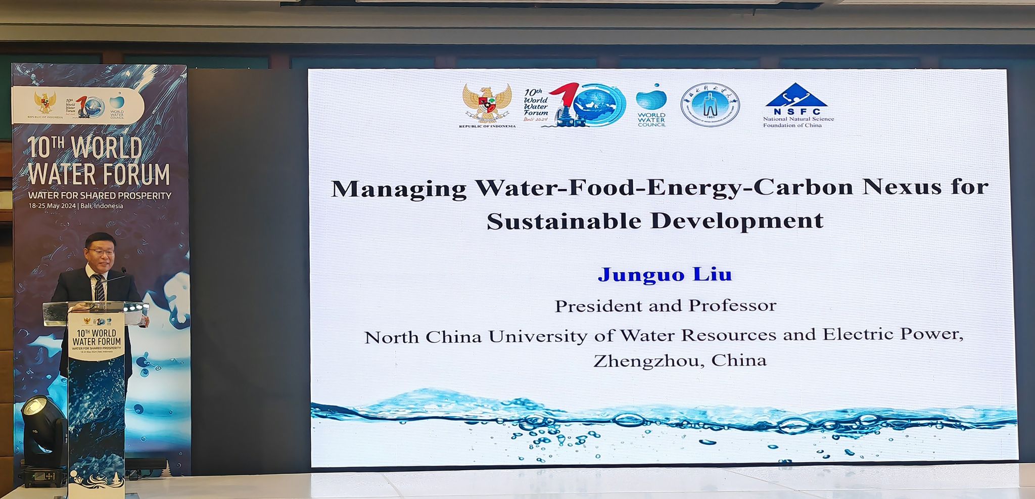 The 10th World Water Forum, co-hosted by the World Water Council and the Indonesian government, was held in Bali, Indonesia, from May 20th to 25th under the theme "Water for Shared Prosperity". Indonesian President Joko Widodo, World Water Council President Loic Fauchon, and Chinese Minister of Water Resources Li Guoying attended the conference and delivered speeches. Professor Liu Junguo, President of North China University of Water Resources and Electric Power (NCWU), was invited to lead a delegation to participate in a series of important events, and successfully hosted a side event titled "Water-Food-Energy-Carbon Nexus for Sustainable Development".