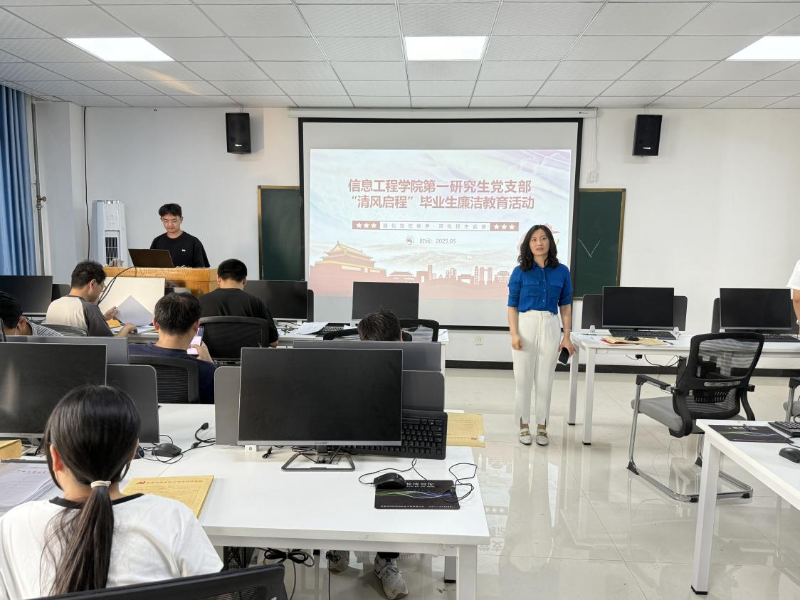 为贯彻落实习近平总书记关于青年成长成才的重要指示精神,切实加强毕业生廉洁教育,信息工程学院第一研究生党支部、第二研究生党支部于2025年5月28日在中栋601举办“清风启程”毕业生廉洁教育主题活动,活动由第一研究生党支部书记吴亚君主持,全体毕业生党员参加。